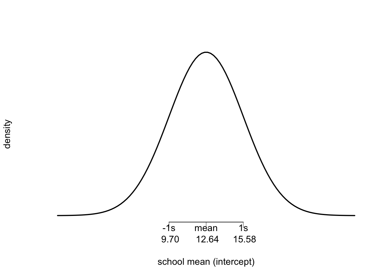 We’ll also discuss the assumption of normality of the random effects next week. The intercept and standard deviation of the random effects together give us information about the unconditional distribution of mean math scores: