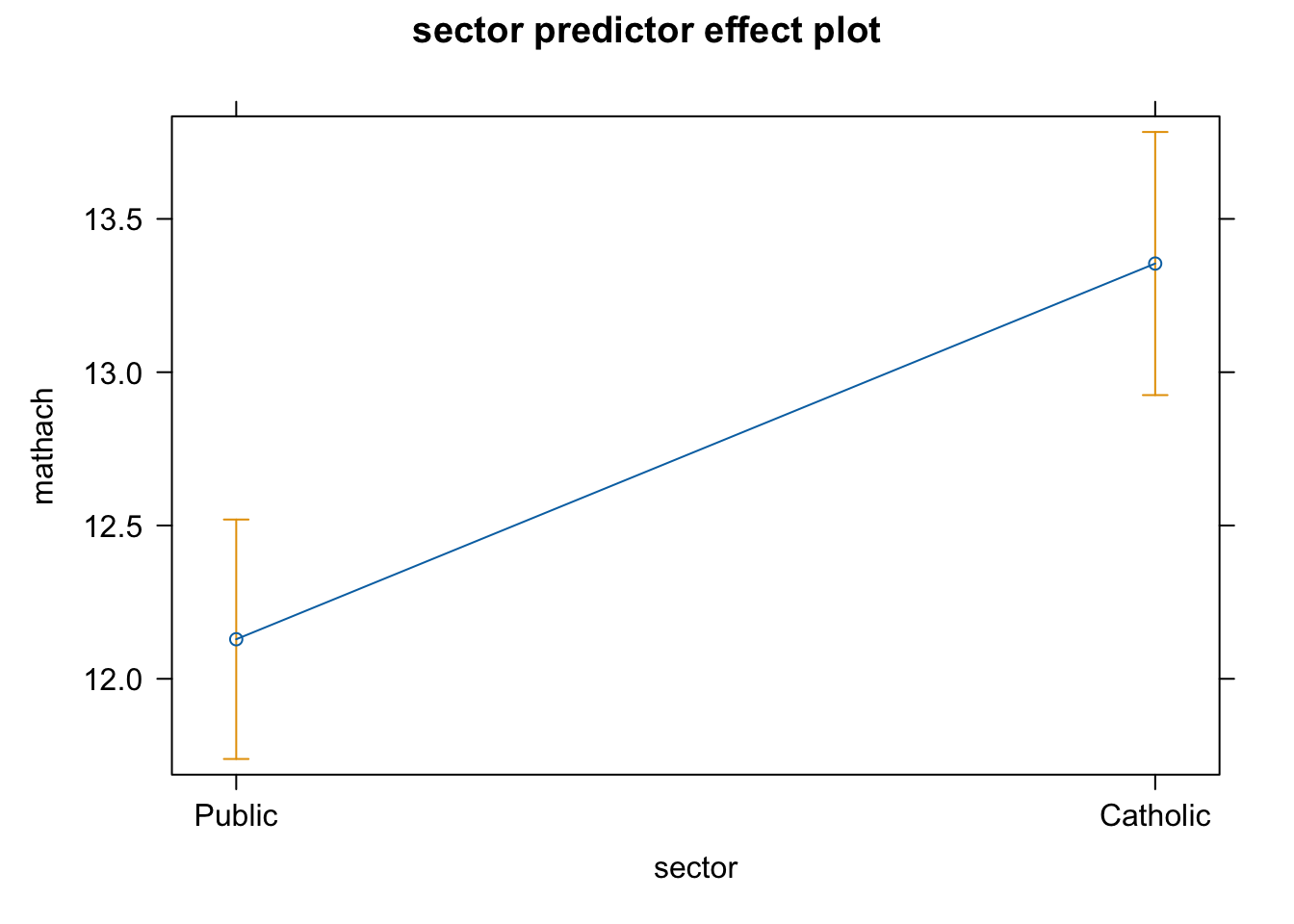 In our output, we see that the inclusion of mean.ses has now reduced the effect of sector. So controlling for mean.ses we have a \(\gamma_{01} = 1.23\) difference between catholic and public schools. Specifically, we might say that if we take a randomly selected catholic school and a randomly selected public school, both of which are at the same level of SES (say the overall average), we’d estimate that their mean level of math achievement scores would be about \(1.23\) points apart.