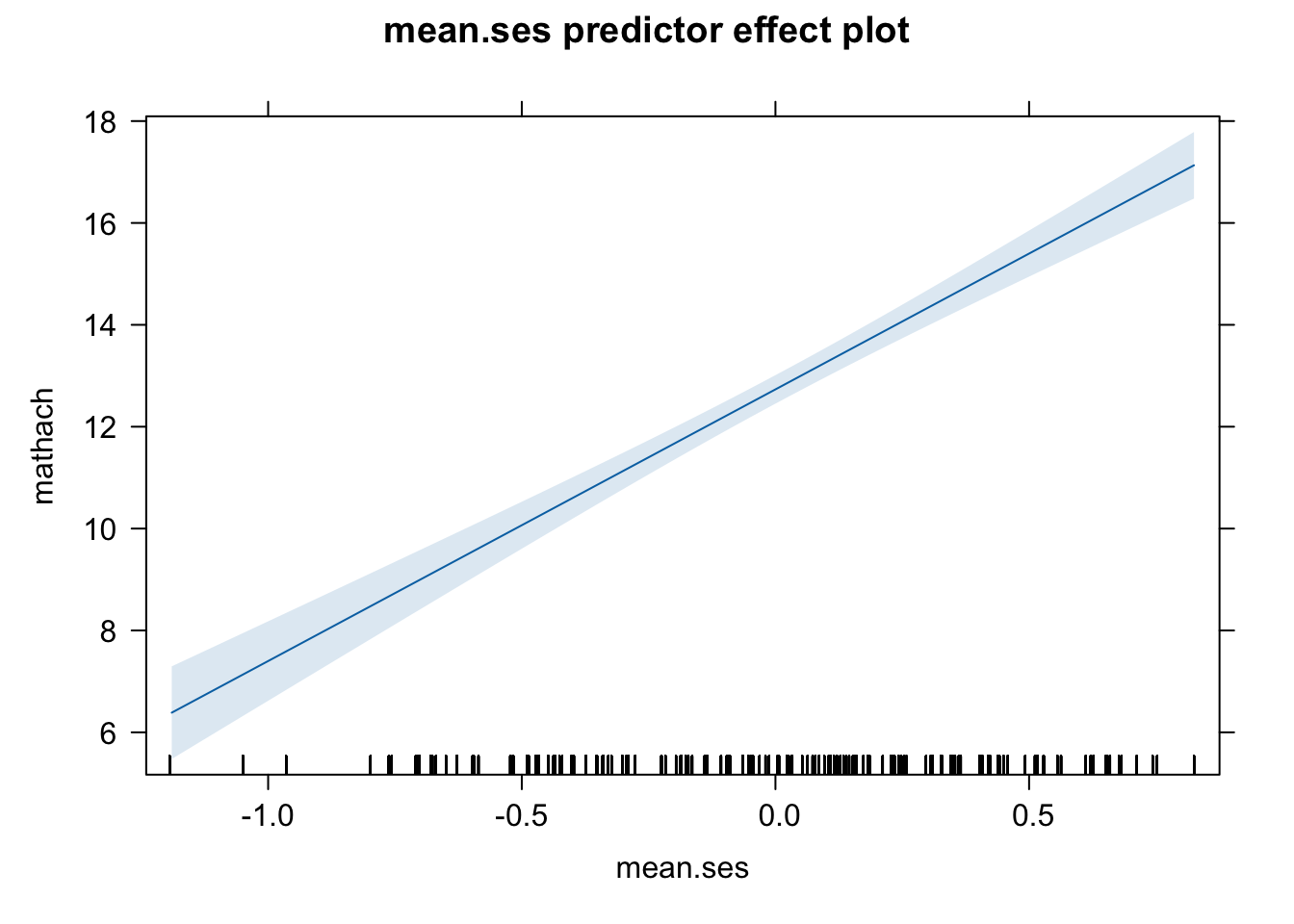We have the same information here, but now \(\gamma_{01}\) is a slope (it was before, but now it REALLY is…). So we estimate that a unit increase in a school’s mean.ses equates to a \(5.86\) increase in the mean math achievement. That seems like a big effect, and indeed, it’s t-value is large, but remember, SES is measured on a relatively small scale:
