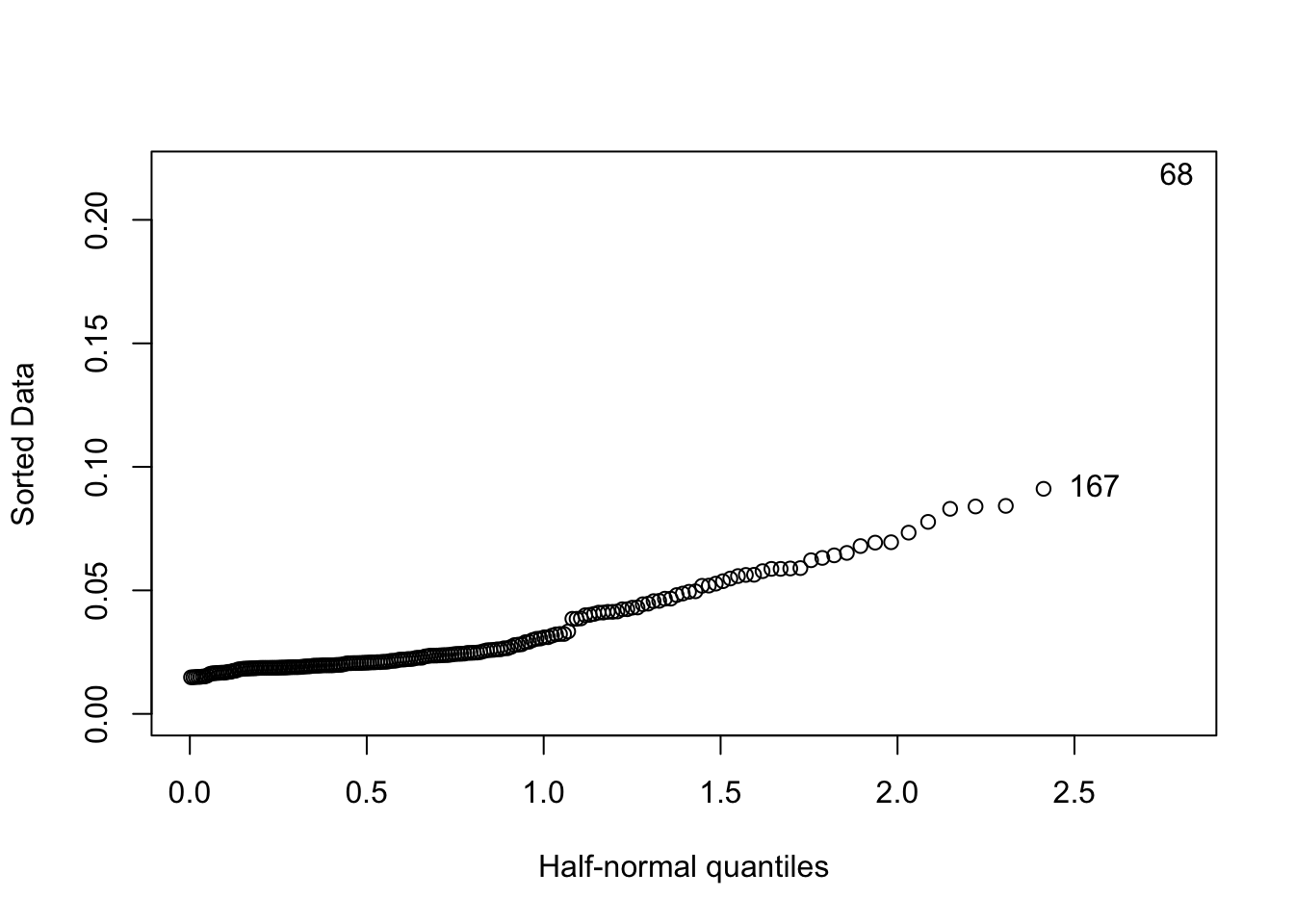 We can, however, produce a kind of QQ plot for the leverage values. We’ll use the halfnorm function from faraway to plot the leverages and pick out any extreme values: