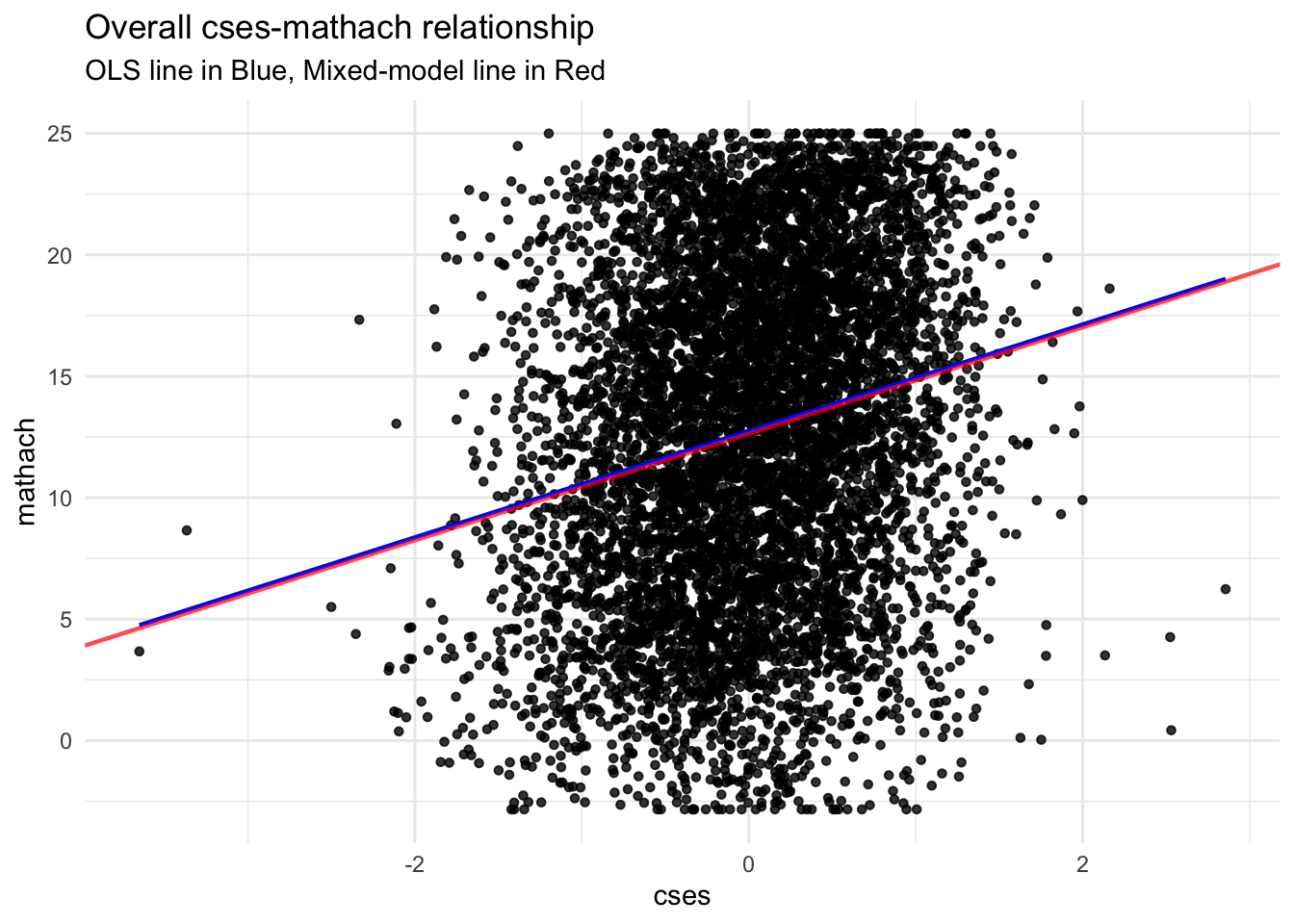 However, we still see that, ignoring the clustering, there’s some degree of linear relationship between a student’s SES and his or her math achievement score.