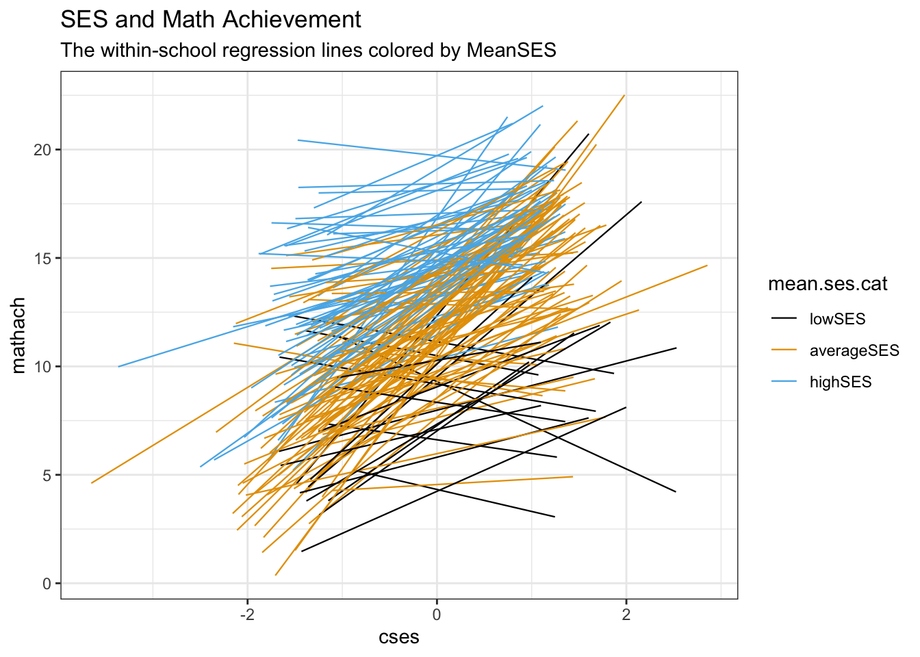 subtitle = "The within-school regression lines colored by MeanSES")## `geom_smooth()` using formula = 'y ~ x'