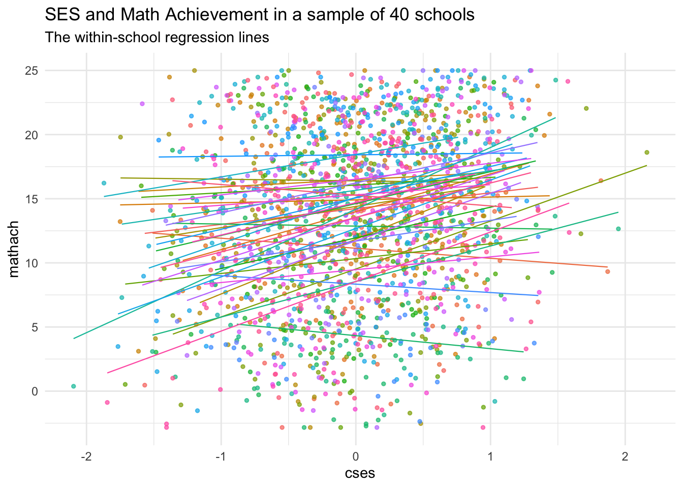labs(title = "SES and Math Achievement in a sample of 40 schools",