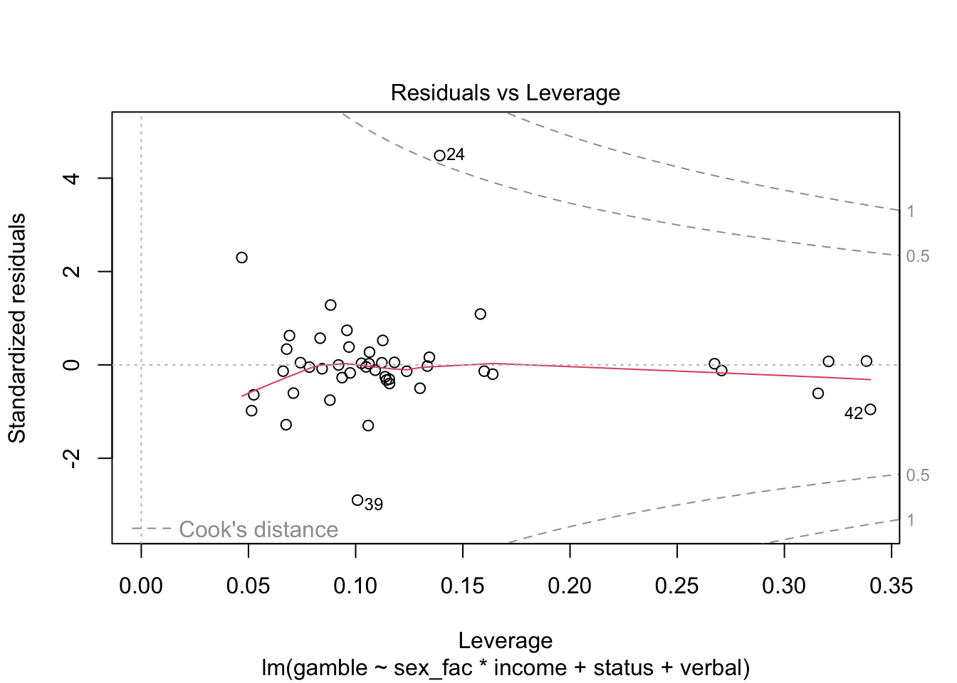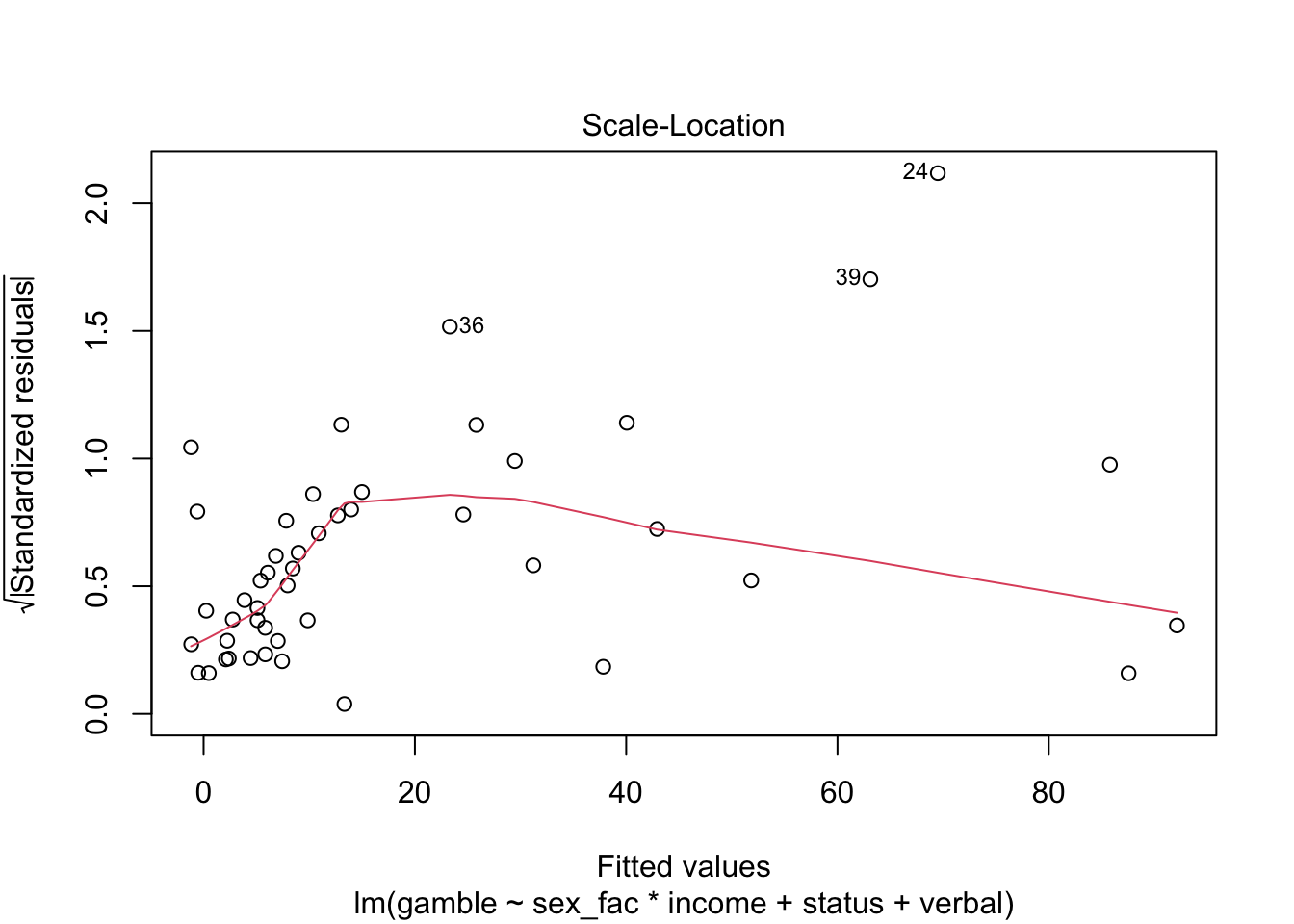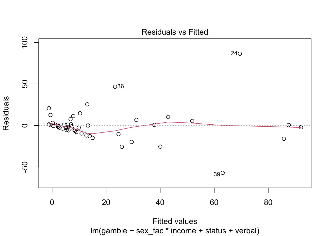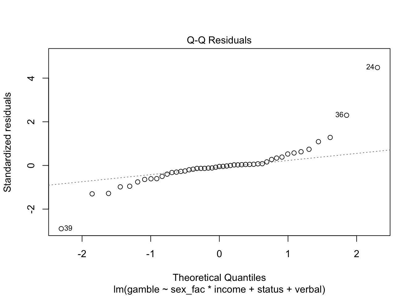 ## lm(formula = gamble ~ sex + status + income + verbal, data = teengamb)