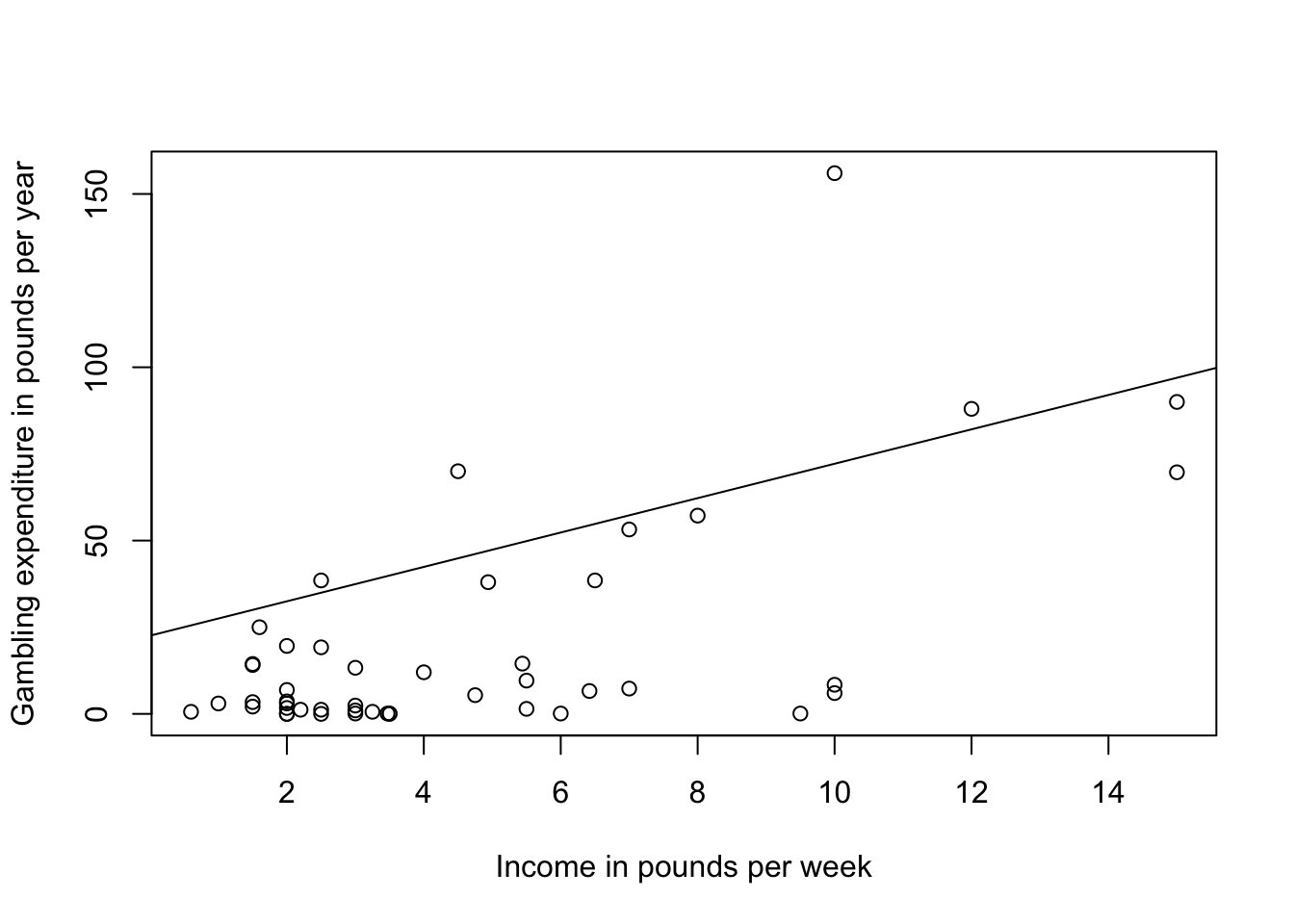 plot(gamble ~ income, teengamb, xlab="Income in pounds per week", ylab="Gambling expenditure in pounds per year")
