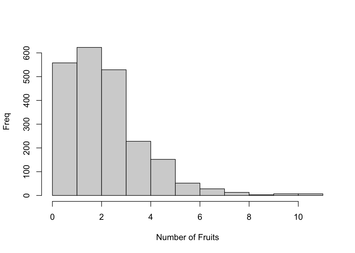 hist(d$FRUITS, breaks = 12, main = "", xlab = "Number of Fruits", ylab = "Freq")